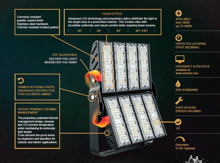 1. The 1000w LED Flood Light Football Stadium Lights Lumileds 5050 SMD, light energy saving 150-180LM/W high brightness and higher color rendering index >Ra80.